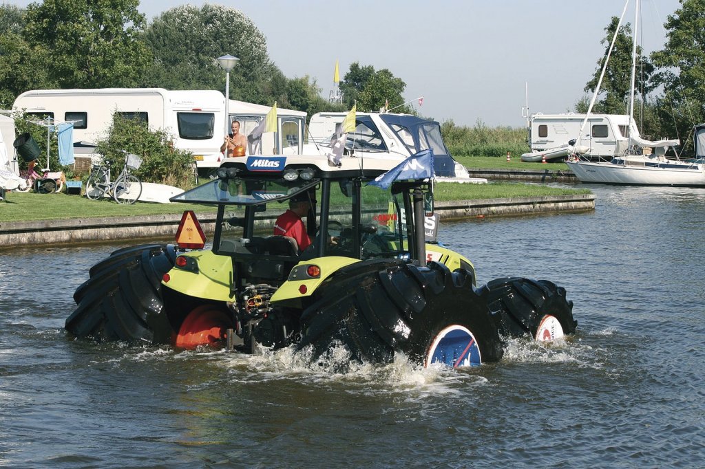 Firma Mitas, člen skupiny Trelleborg, uspořádala spolu se svými partnery dne 14. září v Nizozemsku (v městě Offingawier) zvláštní experiment. Experiment měl poukázat na jasný potencionál zemědělských pneumatik a problém se zhutněnou půdou. Firma obula traktor Claas Axos 320 do masivních nízkotlakých pneumatik a jezdila, respektive plavala s ním po vodě.