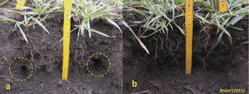 Obr. 4 znázorňuje orniční profily na ploše s kypřením do 180 mm a na kontrole. Na variantě s kypřením je ještě možné pozorovat duté chodby vytvořené radlicí. Ve srovnání s kontrolou vykazovaly rostliny na variantě s kypřením do 180 mm intenzivnější prokořenění půdy.